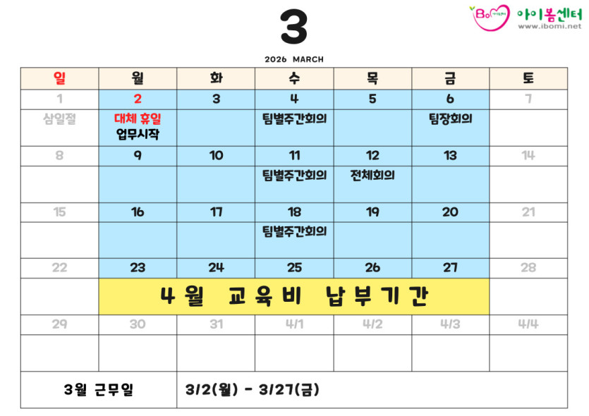 3월 일정표 입니다. 페이지 정보 작성자 관리자 댓글 0건 조회 118회 작성일 26-03-23 11:08 본문 안녕하세요. 아이봄센터입니다.3월 센터 일정표 입니다.수업일정 확인해 주시기 바랍니다.감사합니다. 목록 목록 이전글4월 교육비 납부안내 26.03.23 다음글3월 교육비 납부안내 26.03.23 댓글 0 댓글목록 등록된 댓글이 없습니다.