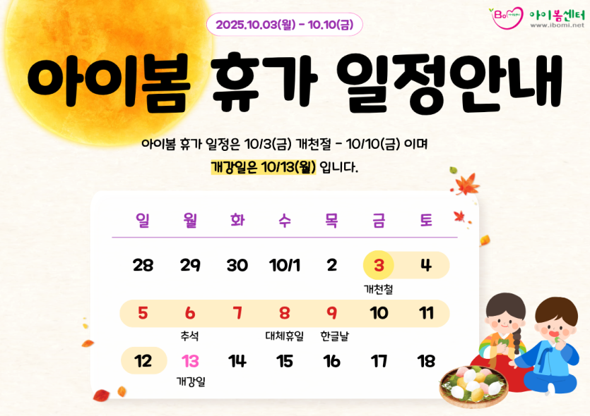 10/3(금·개천절)부터 10/10(금)까지 10일간 휴무합니다.