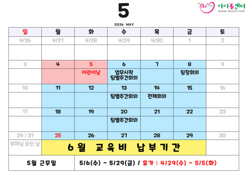 5월 일정표 페이지 정보 작성자 관리자 댓글 0건 조회 11회 작성일 26-04-21 16:44 본문 안녕하세요. 아이봄센터입니다.5월 센터 일정표 입니다.수업일정 확인해 주시기 바랍니다.감사합니다. 목록 목록 이전글아이봄센터 4,5월 휴가 안내 26.04.21 다음글5월 교육비 납부안내 26.04.21 댓글 0 댓글목록 등록된 댓글이 없습니다.