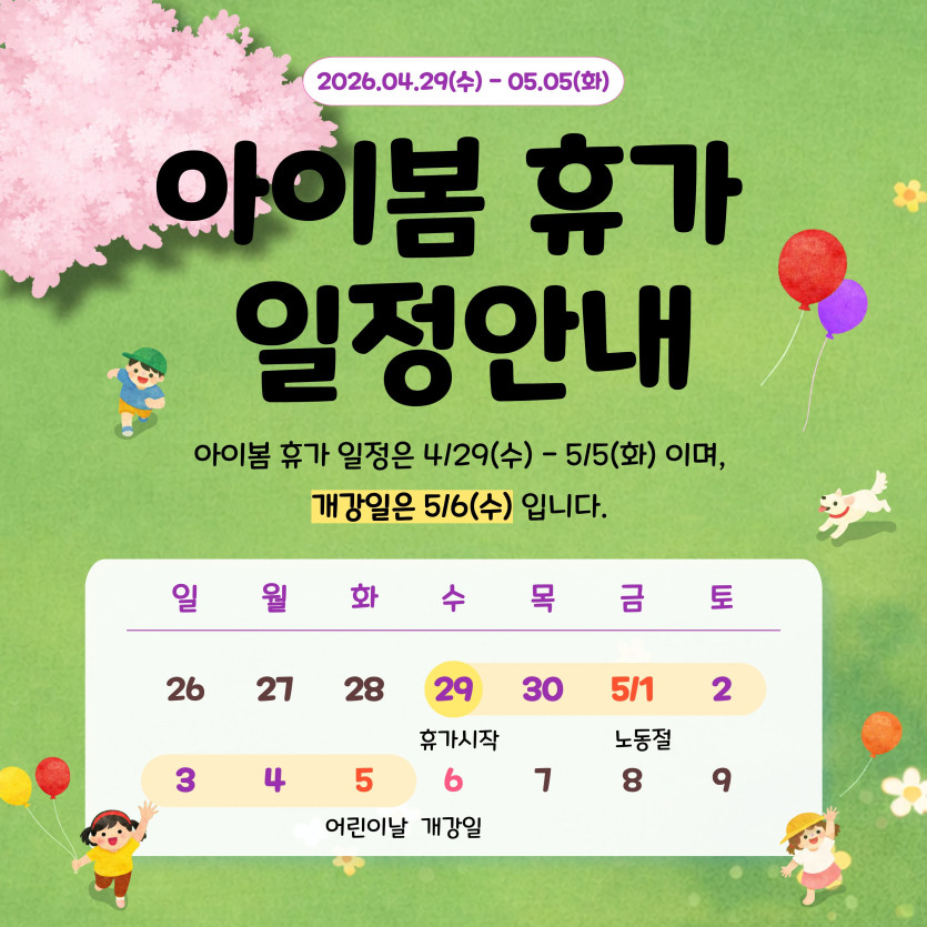 아이봄센터 4,5월 휴가 안내 페이지 정보 작성자 관리자 댓글 0건 조회 15회 작성일 26-04-21 16:48 본문 안녕하세요. 아이봄센터 입니다.센터 휴가 일정 안내드립니다.✔ 휴가기간4/29(수) ~ 5/5(화)✔ 개강일5/6(수)일정 참고하시어 이용에 착오 없으시길 바랍니다.감사합니다. 목록 목록 다음글5월 일정표 26.04.21 댓글 0 댓글목록 등록된 댓글이 없습니다.